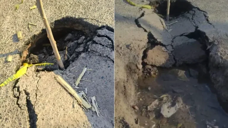 Los Mochis, Sinaloa.- 12 de Agosto de 2025 Un socavón que apareció el día de ayer en la carretera principal de la comunidad de San...