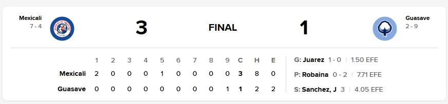 Por Guasave, Julio Robaina (0-2) cargó con el revés al trabajar 4.1 innings, en los que toleró seis hits y tres carreras. Lo relevaron Carlos Vázquez, Mario García, Jeff Ibarra, Víctor Buelna e Iván Izaguirre, quienes colgaron ceros el resto del encuentro.