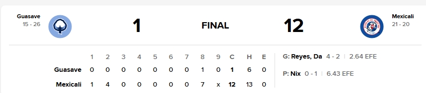 Jacob Nix (0-1) pagó los platos rotos por Guasave al permitir cinco carreras y ocho hits en apenas tres episodios, dejando el resto del desgaste al bullpen compuesto por Víctor Buelna, Carlos Vázquez, Fabián Anguamea, Jeff Ibarra, Tanner Kiest y Yosshel Hurtado.