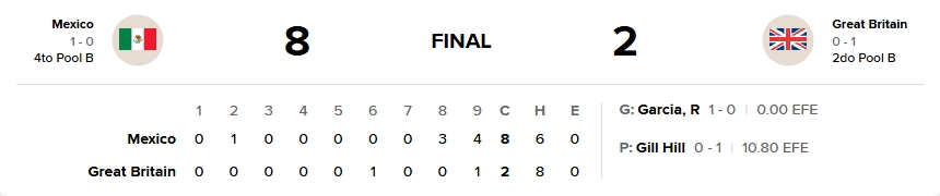 La derrota fue para Gary Gill Hill (0-1), quien permitió dos carreras en el octavo episodio tras otorgar dos bases por bolas que antecedieron al cuadrangular de Jonathan Aranda. Por Gran Bretaña abrió Jack Anderson con labor de tres innings y una carrera permitida. Después lanzaron Nick Wells, Ryan Long, Gill Hill, Tristan Beck, Graham Spraker, quien aceptó tres anotaciones en un tercio de entrada, y Dylan Covey, que cerró el encuentro permitiendo una carrera y dos hits en dos tercios.
