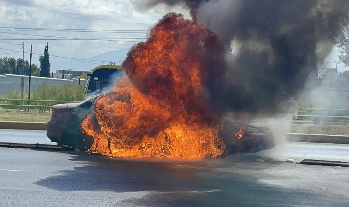 Saltillo, Coah.- 27 de Septiembre de 2025 Completamente calcinado terminó un vehículo la mañana de este sábado sobre el bulevar Venustiano Carranza, antes del distribuidor vial del mismo nombre, lo que provocó pérdidas materiales y caos vial, en Saltillo.