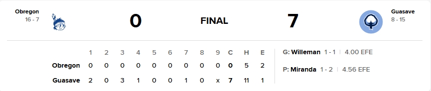 Zach Willeman (1-1) tuvo una salida espectacular y se alzó con la victoria al trabajar seis entradas en blanco, de dos hits y cuatro ponches. Ariel Gracia, Víctor Buelna e Iván Izaguirre cerraron el duelo.