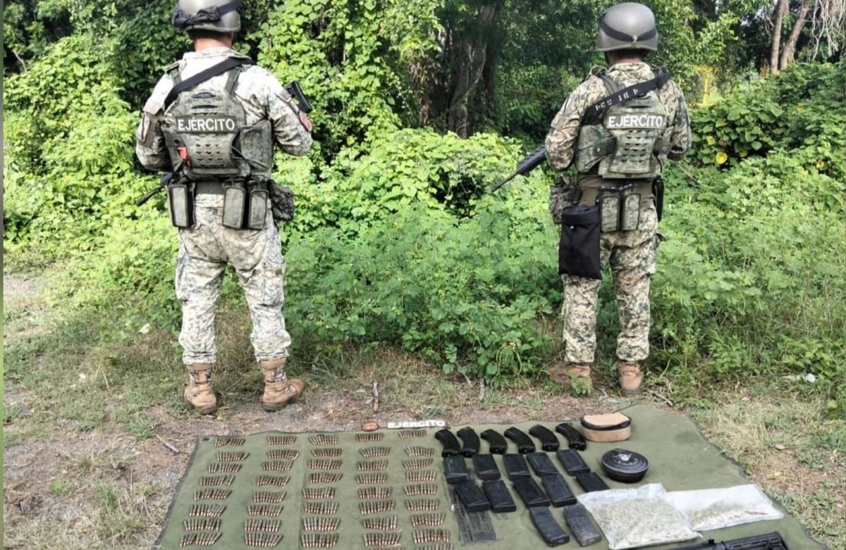 Asimismo, en el poblado de Los Mayos, municipio de Culiacán, elementos de la Guardia Nacional localizaron un vehículo, aseguraron siete armas largas, 63 cargadores, mil 744 cartuchos, cinco chalecos tácticos y 10 placas balísticas.