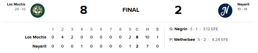 Yoanner Negrín (3-1) se apuntó la victoria con cinco entradas de cuatro hits, una carrera y dos bases por bolas. Desde el bullpen desfilaron Lupe Chávez, Colten Davis, Daniel Duarte, Jonas Garibay y Correa.
