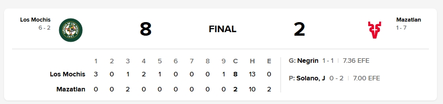 El triunfo fue para el cubano Yoanner Negrín (1-1), quien cumplió con cinco entradas de labor, permitió ocho imparables, dos carreras y recetó un par de ponches. El bullpen mochitense mantuvo el control con relevos de Miguel León, Jonás Garibay, Víctor García y Manuel Urías, quienes colgaron ceros el resto del camino.