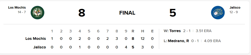 Ronald Medrano (0-1) cargó con la derrota tras aceptar tres anotaciones en seis capítulos. El resto del trabajo quedó en manos de Luis Ángel Rodríguez, Jesús Guzmán y Mario Meza.