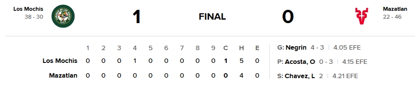 La derrota fue para Octavio Acosta (0-3), quien lanzó seis entradas de cuatro hits, una carrera y tres ponches. Lo relevaron Pablo Téllez, Rafael Kelly y Vidal Nuño, cada uno con una entrada de labor.