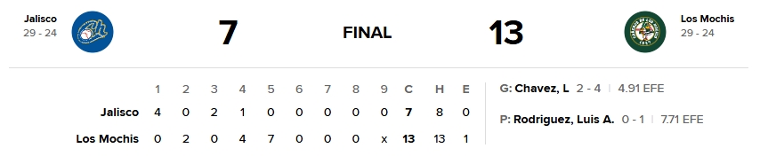 La derrota fue para Luis Ángel Rodríguez, castigado con tres carreras en una entrada. Abrió Alemao Hernández y salió tras tres episodios con cinco carreras permitidas. Isaac Jiménez enfrentó a cuatro bateadores y todos le conectaron de hit, todos le anotaron, mientras que Axel Muñoz, Zac Rosscup, Mario Meza, Miguel Aguilar y Gael Bojórquez se encargaron del resto.