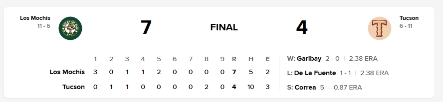 De esta manera se completó la barrida en esta atípica serie en que los Cañeros debieron jugar como visitantes en su propio estadio, debido a las complicaciones que ha tenido la nueva franquicia de Tucson.
