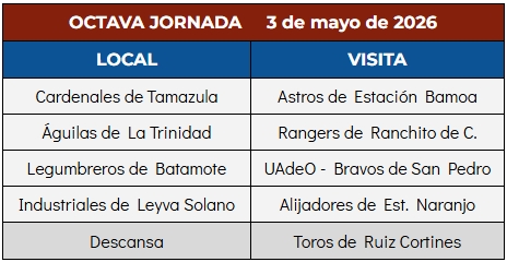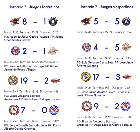 Guasave, Sinaloa. – La séptima jornada de la Liga de Beisbol Chanos Carnicería Arturo Peimbert Camacho concluyó con éxito este domingo 26 de abril del 2026, destacando las limpias propinadas por las Águilas de La Trinidad y los Cardenales de Tamazula, estos últimos manteniendo la etiqueta de invictos en la actual temporada que rinde homenaje a Jesús Zacarías Bojórquez.