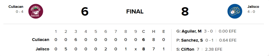 El out 27 llegó con serenidad. Trevor Clifton subió al montículo en la novena entrada y resolvió el trámite con autoridad. Dominó a Estevan Florial por la vía del ponche, retiró a Ramón Ríos con rodado y, aunque permitió sencillo de Allen Córdoba, cerró el juego con elevado de Joey Meneses a la inicial, desatando la celebración en Zapopan.