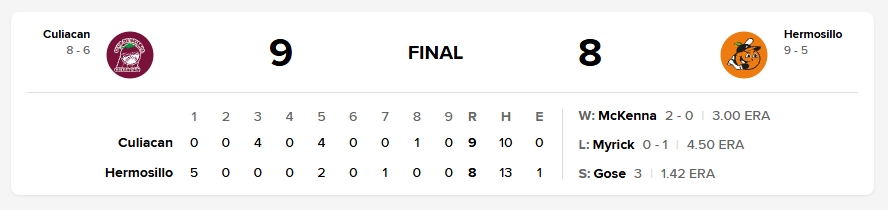 El bullpen guinda se comportó a la altura de una noche que lo exigió todo. Brian McKenna (2-0) se llevó la victoria, y Anthony Gose firmó el salvamento sufriendo, pero cumpliendo. Hermosillo dejó ir oportunidades claves y la derrota terminó en las estadísticas de Tyler Myrick (0-1).