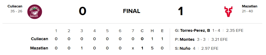 A partir de ahí, Venados se dedicó a defender esa mínima ventaja con brazos firmes. Braulio Torres-Pérez (1-4) firmó su mejor salida de la campaña al trabajar seis entradas de apenas un hit y siete ponches, controlando por completo a la ofensiva guinda. Vidal Nuño (4) se encargó del séptimo episodio, lo retiró en orden con un chocolate y se apuntó el salvamento.