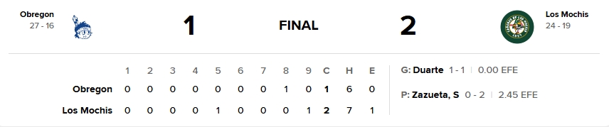 Yaquis también tuvo pocas oportunidades. Contaron con corredores en segunda y tercera con dos outs en la quinta, pero Allen Córdoba fue dominado. En la novena entrada, colocaron hombres en las esquinas ante Daniel Duarte, pero el emergente Guillermo Williamson bateó para doble play. Obregón dejó a siete corredores en las almohadillas.