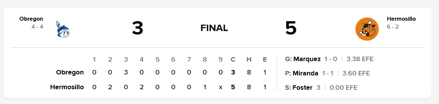 Pero Hermosillo retomó el control en el cuarto episodio. Ángel Ramírez igualó con doblete remolcador y, con las bases llenas, Jasson Atondo negoció pasaporte para impulsar “de caballito” la carrera del 4-3.