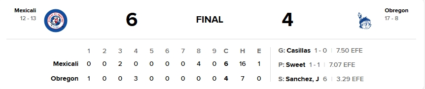 La derrota fue para Braulio Torres-Pérez (0-1), con labor de cinco innings, seis imparables y dos carreras. Desde el bullpen trabajaron Óscar Rojas, A. Ramírez y Alex Tovalín.