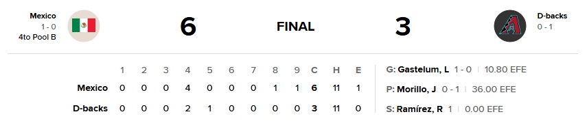 Desde la loma, Taijuan Walker abrió por México con dos entradas y un tercio, permitiendo dos imparables, dos bases por bolas y dos ponches. El triunfo fue para Luis Gastelum, quien trabajó dos tercios con dos carreras admitidas. Alexander Armenta permitió una anotación en una entrada, mientras que Robert García, Alex Carrillo y Roel Ramírez cerraron la puerta; este último se acreditó el salvamento con dos entradas de relevo.