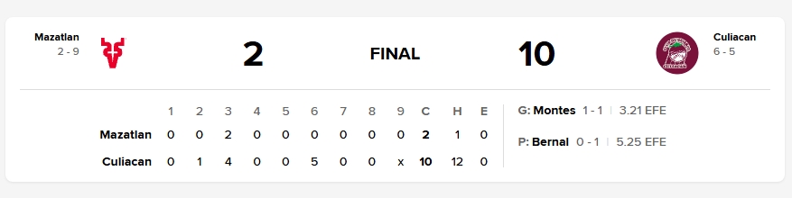 Por Mazatlán, Jonathan Bernal (0-2) sufrió el revés al admitir cinco carreras en 4.1 entradas. Lo relevaron Adolfo Ramírez, Demetrio Gutiérrez, Mario Jiménez, Óscar Rojas y Jorge Franco.