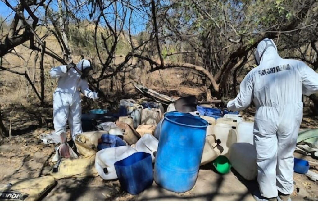 Cosalá, Sin.- 3 de Abril de 2026 Elementos de la Secretaría de Marina (Semar), en coordinación con la Fiscalía General de la República (FGR), localizaron y neutralizaron un laboratorio clandestino presuntamente dedicado a la producción de metanfetamina, en las inmediaciones del poblado de La Palma, en el municipio de Cosalá, en Sinaloa. Por la ubicación, se informó que posiblemente el laboratorio clandestino pertenezca a Los Chapos.
