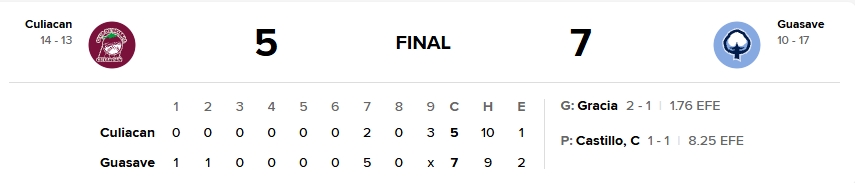 Culiacán atacó en la novena con tres anotaciones, pero se quedaron cortos. Poncho Ruiz anotó la primera en pifia del segunda base Esteban Quiroz a batazo de J.P. Martínez; tras dos outs y con dos en base, Jon Singleton disparó doblete para traer las carreras cuatro y cinco. El juego concluyó con ponche a Fernando Villegas y Guasave se llevó el primero de la serie.