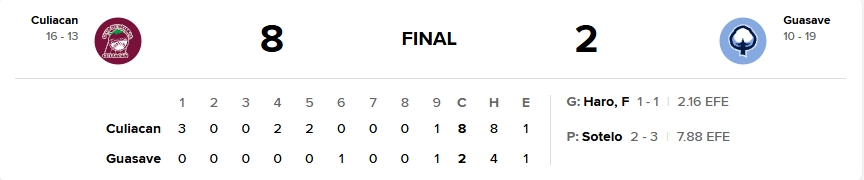 Francisco Haro (1-1) obtuvo su primera victoria como abridor con seis entradas de dos hits y una carrera. El bullpen hizo su trabajo con Cristhofer Lozoya, David Gutiérrez, Sasagi Sánchez y Anthony Gose.