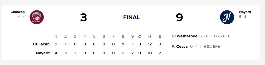 El triunfo fue para Jared Wetherbee (2-0), quien lució dominante durante siete entradas, permitiendo solo una carrera y ocho hits, con notable control sobre la alineación guinda. En relevo trabajaron Porfirio Guerrero y Joel Rangel, ambos con una entrada de labor y una carrera admitida.