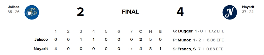 Robert Dugger (1-0) se apuntó su primera victoria en la LMP tras lanzar cinco entradas y dos tercios, permitiendo cuatro hits y dos carreras, con cuatro bases por bolas y cinco ponches. El cierre quedó en manos del colombiano Sadac Franco, quien retiró los últimos cuatro outs para sumar su séptimo salvamento. La derrota fue para Muñoz (1-2), castigado con las cuatro carreras en apenas una entrada y dos tercios, con Alemao Hernández cubriendo el resto del camino.