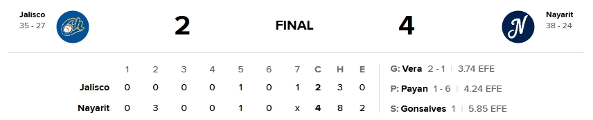 Charros reaccionó con par de destellos aislados. En la tercera entrada, Cristopher Gastélum conectó cuadrangular solitario al izquierdo para recortar distancia. Un inning después, Julián Ornelas abrió con sencillo y terminó anotando con elevado de sacrificio de Francisco Córdova, combinado con error del jardinero central Aaron Zavala, para colocar el marcador 4-2. Fue lo más cerca que estuvo la visita.