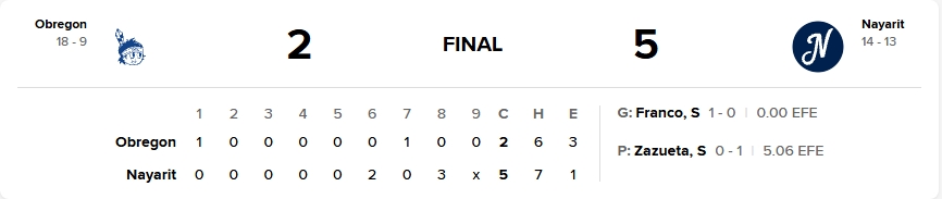 La derrota fue para Samuel Zazueta (0-1) al permitir tres carreras sin poder retirar out en el octavo. Odrisamer Despaigne lanzó siete capítulos de seis hits y dos carreras; siguió Zazueta y terminó Brandon Brennan.