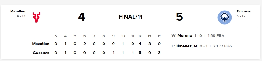 El equipo nayarita se fue al frente en la primera entrada, luego de que Brandon Villarreal conectó doblete con un out y enseguida anotó con sencillo al izquierdo de Ricardo Valenzuela, quien bateó de 3-1 y dejó su porcentaje en .415.