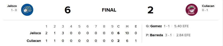 Jalisco encendió la mecha en la primera entrada. Michael Wielansky alcanzó la inicial tras un error del antesalista Ichiro Cano y avanzó a la intermedia con sencillo de Julián Ornelas al jardín izquierdo. Entonces apareció Mateo Gil, quien conectó un sólido triple por la raya del jardín izquierdo para enviar a ambos corredores al plato y adelantar a los Charros 2-0, marcando el tono agresivo con el que arrancó la serie.
