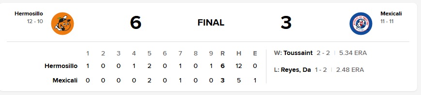 JOYITA DE TOUSSAINT GUÍA A HERMOSILLO AL TRIUNFO 6-3 SOBRE MEXICALI