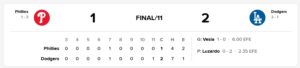 Tyler Glasnow lanzó seis entradas sin permitir carreras en su primera apertura de postemporada como Dodger, respondiendo a 6.1 entradas e una carrera permitida por el dominicano Cristopher Sánchez. Los Filis fueron los primeros en anotar, gracias a una carrera de Emmet Sheehan en la parte alta de la séptima entrada, pero medio inning después, el quisqueyano Jhoan Durán concedió una base por bolas con las bases llenas a Mookie Betts para empatar el juego. Roki Sasaki lanzó tres entradas perfectas para ayudar a llevar el juego a entradas extras, y Alex Vesia mantuvo el marcador en cero en la entrada 11.