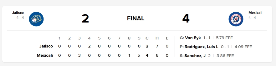 El duelo se mantuvo cerrado hasta la octava entrada, cuando Mexicali aseguró el triunfo con otra jugada de sacrificio. Yadir Drake, de nuevo protagonista, elevó al jardín izquierdo permitiendo a Cade Gotta anotar en pisa y corre la cuarta y definitiva carrera del encuentro.