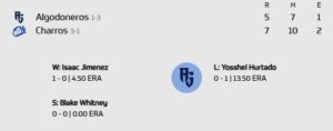 Con este resultado, los Charros aseguran la serie y buscarán completar la barrida este viernes, nuevamente en el Estadio Panamericano, en duelo programado a las 17:00 horas. El enfrentamiento probable en la loma será entre Vidal Sotelo y Axel Jeremy Muñoz.