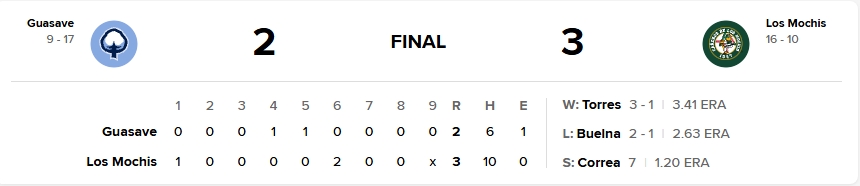 Darel Torres (3-1) se llevó la victoria al lanzar seis episodios de dos carreras. Danis Correa retiró la novena para apuntarse su séptimo rescate de la campaña. La derrota fue para Víctor Buelna (2-1), al recibir el palo de cuatro estaciones por parte de Urías.