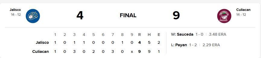 Charros recortó en la cuarta con carrera anotada por Michael Wielansky. Julián Ornelas cerró la cuenta de los tapatíos con jonrón solitario en la octava para el 9-4 definitivo.