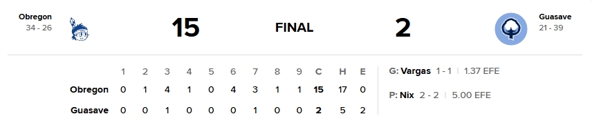La ofensiva de Obregón no bajó el ritmo. En la séptima entrada sumaron tres carreras más, aprovechando rodado productor de Taiki Sekine y un sencillo de Roberto Valenzuela combinado con error defensivo. En la octava llegó otra rayita tras un error del campocorto Eddy Díaz, y en la novena Víctor Mendoza puso el sello final con cuadrangular solitario al derecho central para el 15-2 definitivo.