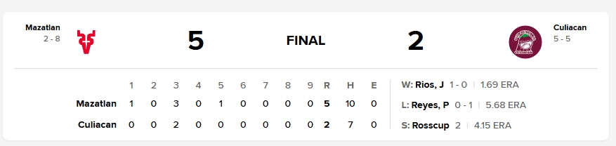 Desde ese momento, el relevo de Mazatlán se encargó de preservar el resultado con autoridad. Jesús Ríos (1-0) se llevó el triunfo tras un relevo efectivo al abridor Édgar Torres, quien trabajó las dos primeras entradas. Luego desfilaron Vidal Nuño, Alex Tovalín y Zac Rosscup, este último consiguiendo su segundo salvamento de la campaña con cierre perfecto.
