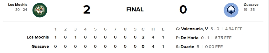 El pitcheo fue la firma. Los Mochis usaron seis brazos para limitar a cuatro hits a la ofensiva local y recetar quince ponches. Abrió Manuel Urías con dos entradas y un tercio de un hit, cuatro bases y cinco ponches; lo relevó el ganador Vicente Valenzuela (3-0) con dos entradas y dos tercios de otro imparable y cinco chocolates, seguido por Lupe Chávez, Irving Machuca y Colten Davis, hasta que Daniel Duarte cerró la novena para su quinto salvamento.