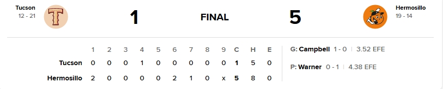 Con el triunfo, Hermosillo igualó marca de 19-14 con Nayarit, pero se instala en la tercera posición por dominio. Del otro lado, Tucson sigue navegando entre aguas agitadas, aferrado al octavo lugar y con la sombra de la zona roja cada vez más cerca.