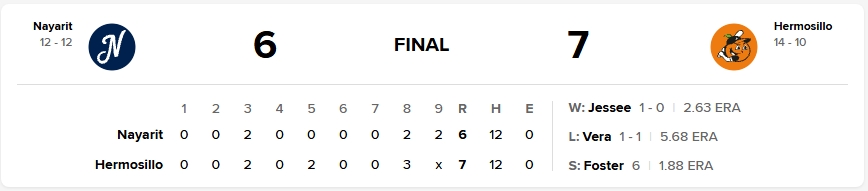 El triunfo fue para Chase Jessee (1-0), quien trabajó una entrada con dos carreras permitidas, y Foster se quedó con el rescate también recibiendo par de anotaciones. La derrota fue para Alexis Vera (1-1) en labor de relevo al permitir las tres carreras dee la octava.