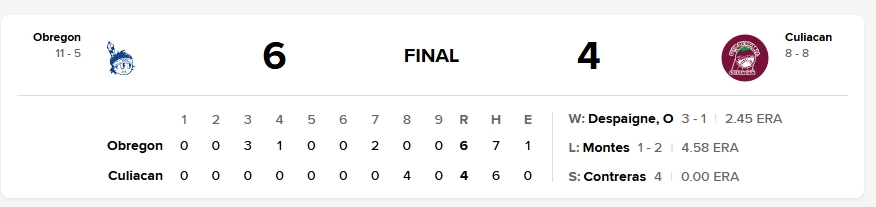 Desde el inicio, el abridor cubano Despaigne se mostró en control total, limitando los bates de Culiacán y retirando con autoridad las primeras entradas. Su comando y experiencia mantuvieron en silencio a la ofensiva local, permitiendo a la Tribu trabajar con comodidad y construir una ventaja temprana. Despaigne se apuntó la victoria luego de 6 innings de labor, permitierndo 3 hits sin daño, recetó 5 ponches y dejó su efectividad en 2.45 ERA. La derrota la cargó el serpentinero Aldo Montes, mientras que el rescate fue para Efraín Contreras.
