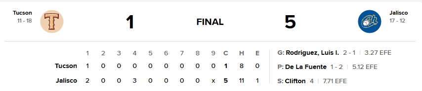 En la cuarta entrada, Arturo Rodríguez castigó con un jonrón de tres carreras, su primero del calendario, llevándose por delante a Mateo Gil y Julián Ornelas para ampliar la ventaja jalisciense 5-1. Esa cifra se mantendría hasta el último out.