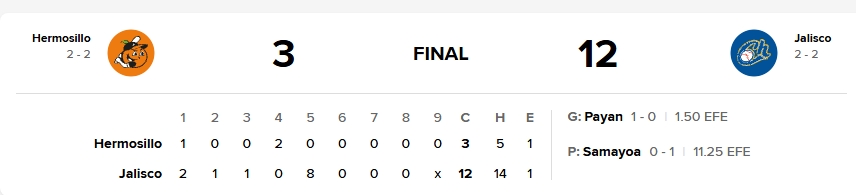 Desde la loma, Luis Payán (1-0) sostuvo a Charros con una salida sólida de seis entradas, permitió cuatro hits y tres carreras -solo una limpia-, otorgó una base y ponchó a cinco. El bullpen completó el trámite con Alemao Hernández, Isaac Jiménez y Bryan Locano, cada uno con un episodio sin sobresaltos.