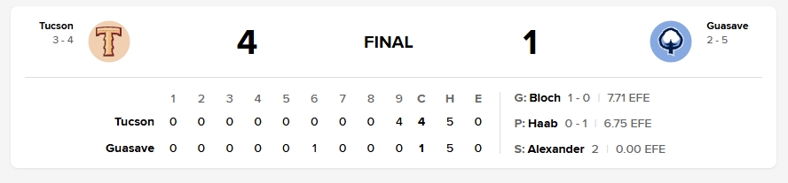 El triunfo fue para Esteban Bloch (1-0), quien lanzó una entrada perfecta en relevo, mientras que Alexander (2) se apuntó el salvamento tras retirar la novena en cuatro bateadores. En total, Tucson utilizó a Daniel de la Fuente, Eduardo Mares, Carlos Bustamante, Edwyn Valle, Bloch y Alexander.