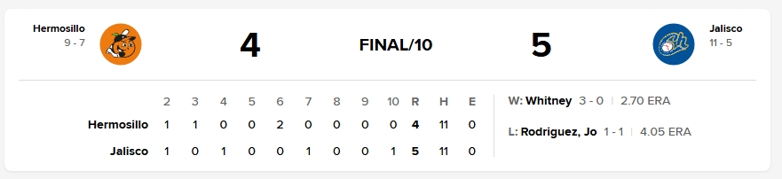 El triunfo fue para Blake Whitney (3-0, 2.70 ERA), quien trabajó la parte alta de la décima sin daño, mientras que Jorge Rodríguez (1-1, 4.05) cargó con la derrota.