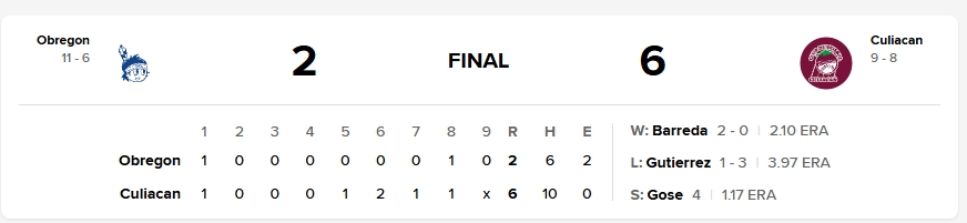 En relevo por Culiacán trabajaron David Gutiérrez (0.2 IP, 2 H, 1 R, 1 BB, 1 K) y Anthony Gose (1.0 IP), quien se apuntó su cuarto salvamento.