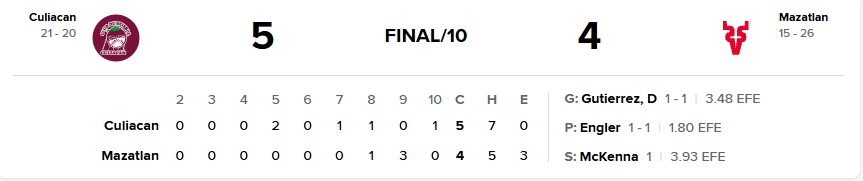 En la décima, Culiacán recuperó el pulso. Con Jon Singleton iniciando en segunda y sustituido por el corredor emergente Valentín Hernández, Joey Meneses elevó al central para avanzarlo a tercera. Entonces apareció Orlando Martínez con un elevado de sacrificio al derecho, suficiente para que Hernández cruzara la registradora con el 5-4 definitivo.