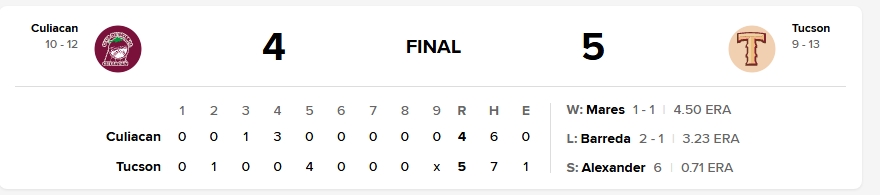 TUCSON REMONTÓ Y VENCE 5-4 A CULIACÁN EN EL ESTADIO TOMATEROS